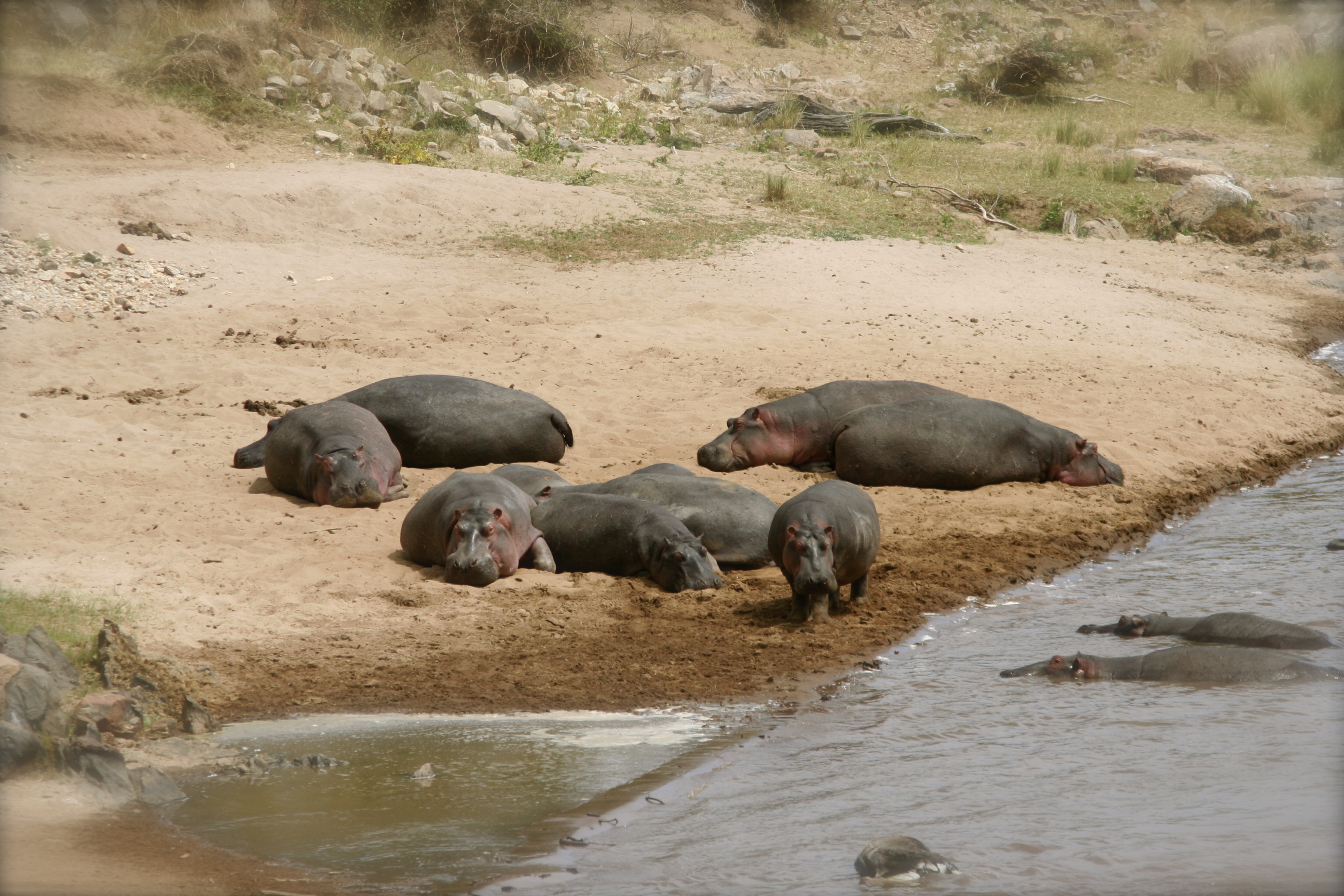 Sunbathing hippopotamuses